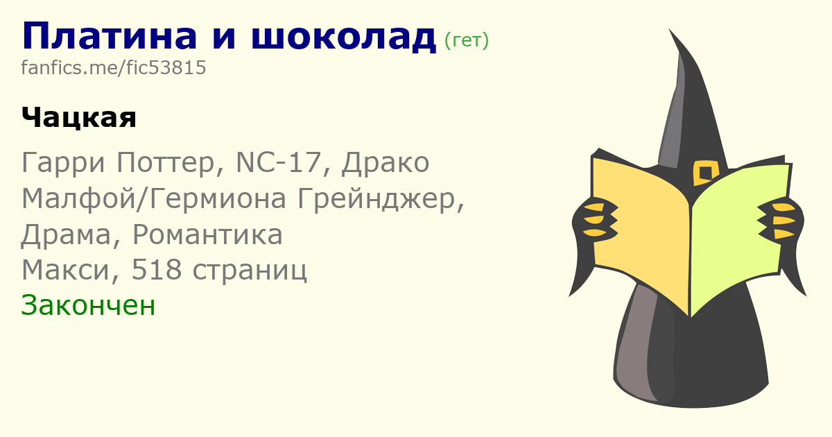 | Zhukovakate Фику лет 10, тогда такое было в новинку, вдохновленное Жаждой. Сейчас я его и читать бы не стала, если честно. Хотя и в наше время пишут подобные, а то и более жестокие вещи, здесь хоть Гермиону Малфой не насилует и на том спасибо. К женским персонажам, их безропотности много вопросов, но я их задала ещё в 2019 году, когда только пришла в фанфикшн и читала всю популярную драмиону подряд. ПиШ почитать стоит хотя бы для того, чтобы знать какой есть тренд на драмиону, многим именно такие токсичные отношения нравятся. Автор вроде даже переписывала эту работу, но я не следила, не знаю, закончила она или нет. 3 | |